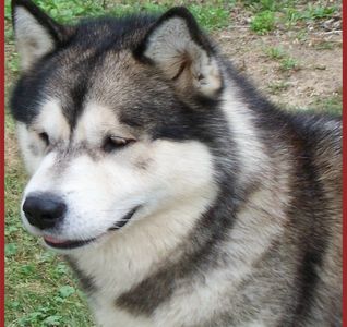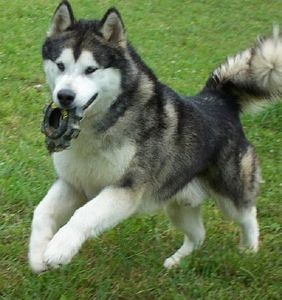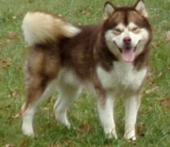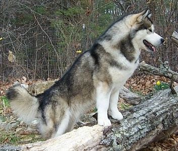 Malamute, one of the oldest Arctic sled dogs, is a powerful and substantially built dog with a deep chest and strong, well-muscled body. There is a natural range in size in the breed. Males, 85 - 95 pounds, females, 65-75 pounds. The Malamute stands well over the pads, and this stance gives the appearance of much activity and a proud carriage, with head erect and eyes alert showing interest and curiosity. The head is broad, Ears are triangular and erect when alerted, muzzle is bulky.. not pointed or long, yet not stubby. The coat is thick with a coarse guard coat of sufficient length to protect a woolly undercoat. Malamutes are of various colors. Face markings are a distinguishing feature. These consist of a cap over the head, the face either all white or marked with a bar and/or mask. The tail is well furred, carried over the back, and has the appearance of a waving plume. Alaskan Malamutes require a long-term commitment to obedience, activity, exercise and entertainment... their unique character, intelligence and energy level can frustrate you, will undoubtedly entertain you, and can bring you great joy (when they're happy!) or great grief (when they're not!). If this type of relationship does not appeal to you, then consider another breed.